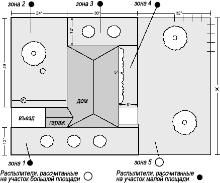 Каждый сад состоит из различных типов растений, которые требуют различной регулярности и интенсивности полива. По этому на первой стадии проектирования определяются зоны с различным режимом полива, например: полив газона, полив цветников, полив крупномерных деревьев, полив живой изгороди и т.п. В этих зонах размещаются оросители и выбираются распылительные насадки и форсунки, оптимально подходящие для данной зоны и полностью ее перекрывающие. На данном этапе проектируются также места размещения поливочных розеток и шланга капельного полива. По окончанию данного этапа становится известным общее количество оросителей и поливочных розеток.